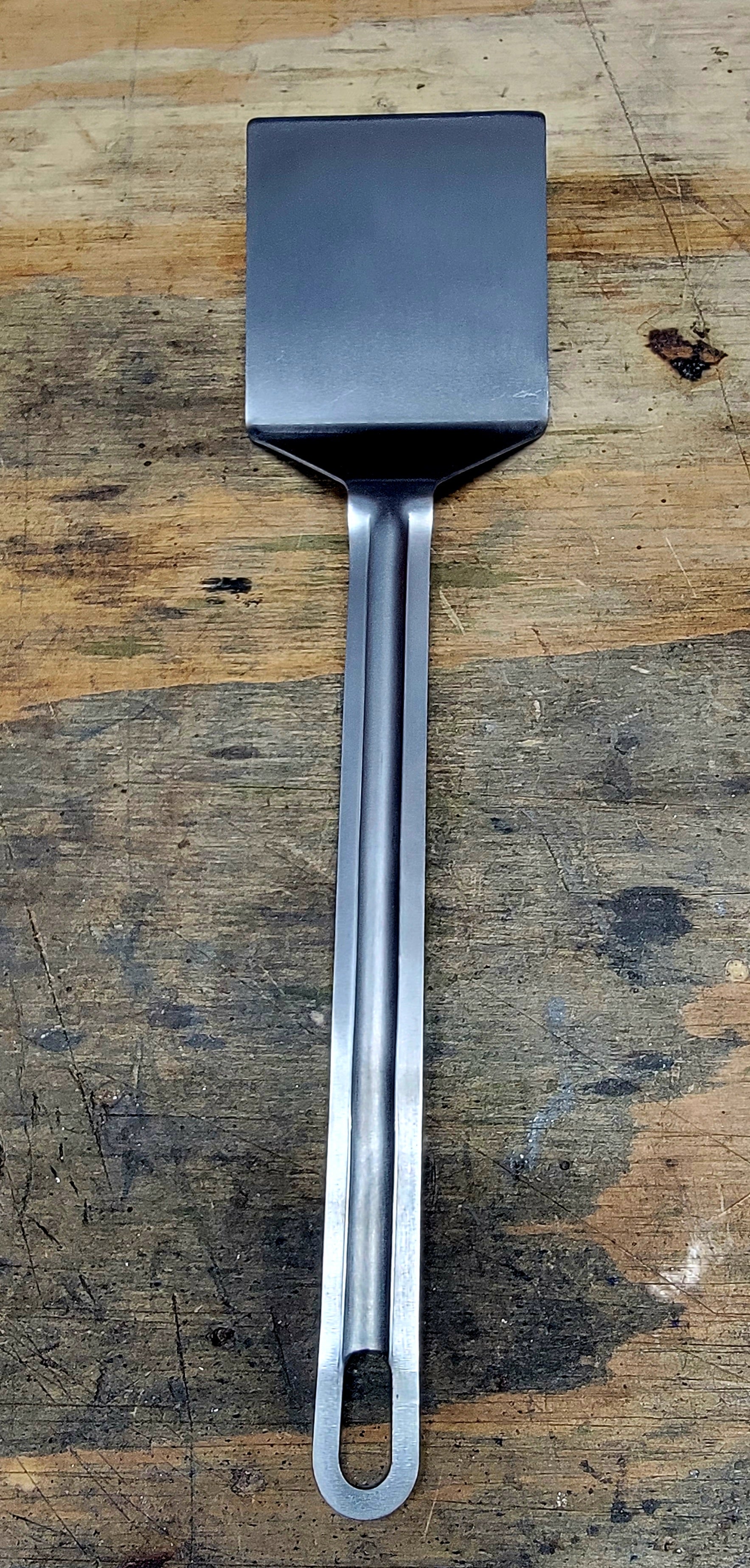 A "full size" camping spatula without slots. Slightly smaller than a home grilling size spatula but bigger than what you'd want on a backpacking trip. Single piece construction for years of durability.
