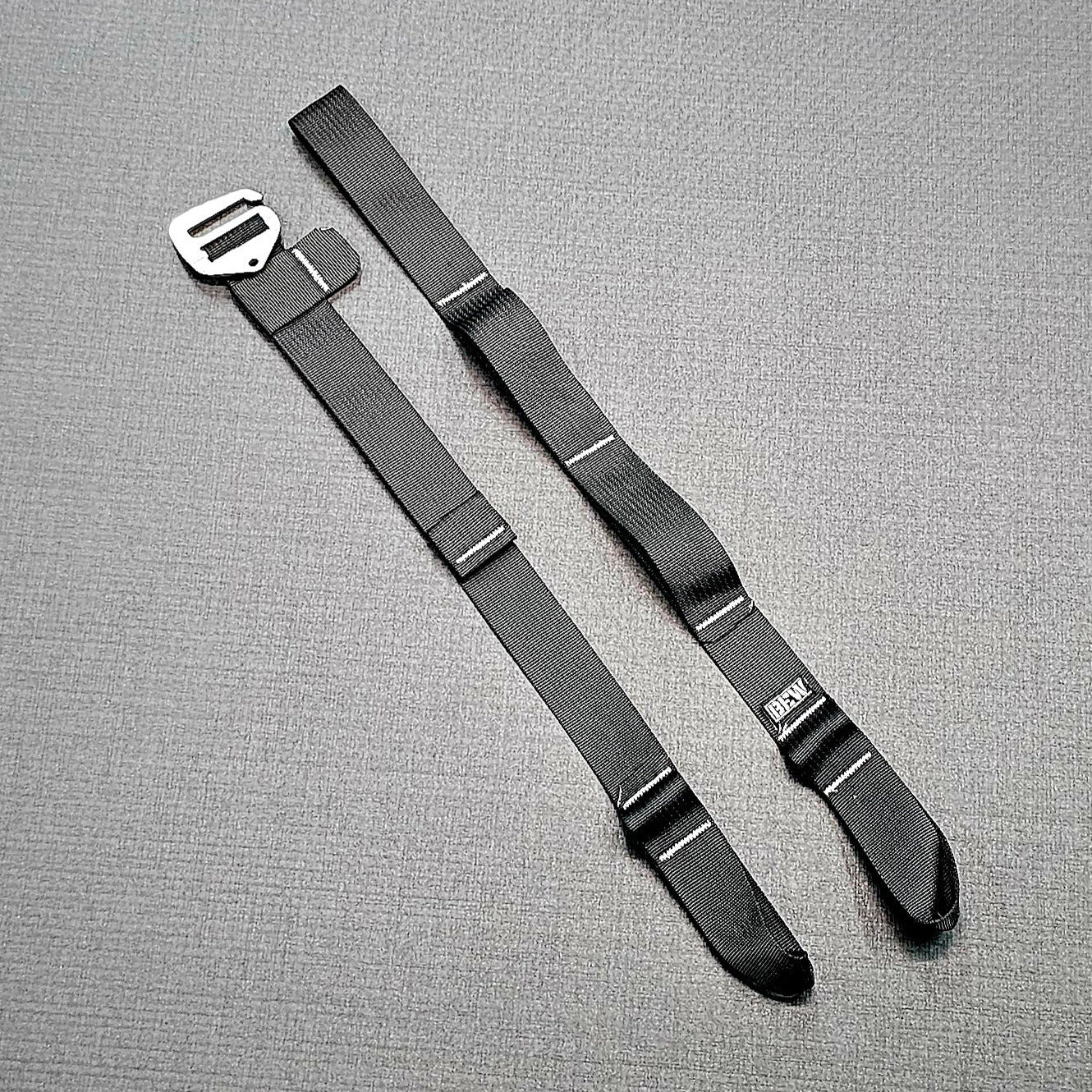 Toboggan Sled Strap Kit, comes with one buckle strap and one loop strap, enough to make one lashing across a sled. Will fit across most toboggan bags and wood stoves on a standard 15" wide toboggan. Uses custom polished 1" BEW G-hook.
