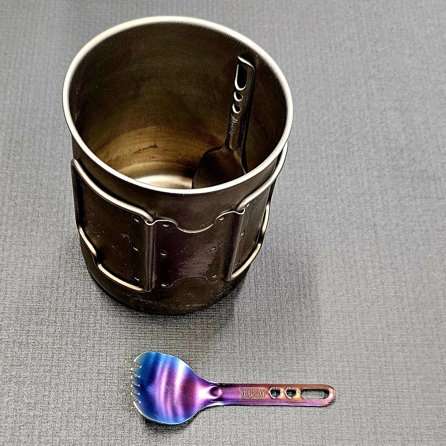 Small enough to fit in a mug or your pocket yet big enough to be extremely useful. The Stubby Titanium Spork is handcrafted out of pure titanium in northern Minnesota. This unique utensil came to be by many ultralight backpackers and buschcrafters wanting something small to fit better in their pack or cook kit. The BEW Stubby Titanium Spork is offered in five finishes, natural titanium, anodized Brown, Blue, Purple, and Prism.