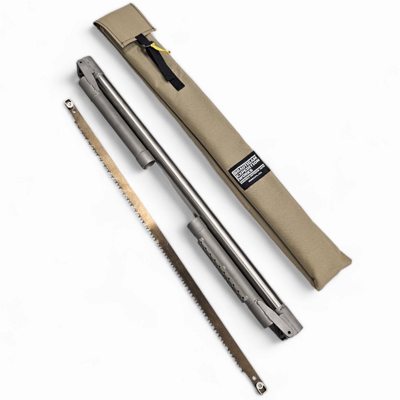 The BEW titanium folding camp saw dubbed the "BEW Saw" is made from high strength titanium alloy to be the strongest and lightest folding bow saw on the market of equal size. This patent pending design uses no cams or wing nuts to create the tension of the blade while allowing for blade stretch. This saw is assembled similar to stringing a long bow, simply flex the frame to allow the blade to slip in place. The round tubing is more ergonomic, cutting down hand fatigue. Titanium happens to be a terrible heat sink, so rest assured that this saw will not draw the heat out of your hand like an aluminum saw will in the winter. The "BEW Saw" not only saws better, it will feel better cut after cut.